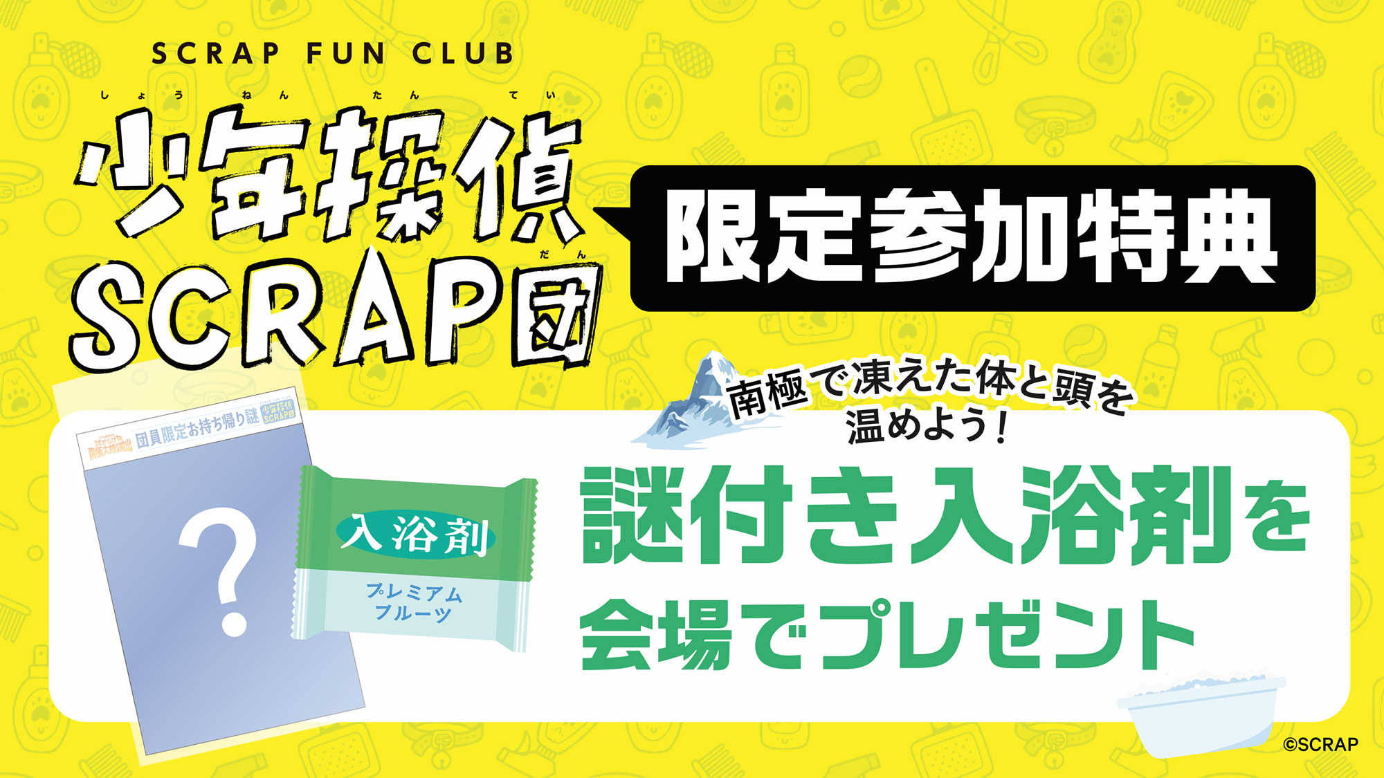 そんな本イベントにご参加いただいた少年探偵SCRAP団(FC)会員限定で、「南極で凍えた体と頭を温めよう!謎付き入浴剤」を無料で配布いたします。イベントだけでは謎を解き足りない方にも、謎解きの後はお風呂でゆっくりリラックスしたい方にもおすすめです!