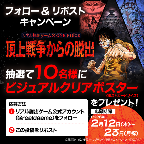 ビジュアルクリアポスターを10名様にプレゼント! リアル脱出ゲーム×ONE PIECE『頂上戦争からの脱出』開催記念フォロー&リポストキャンペーン実施!