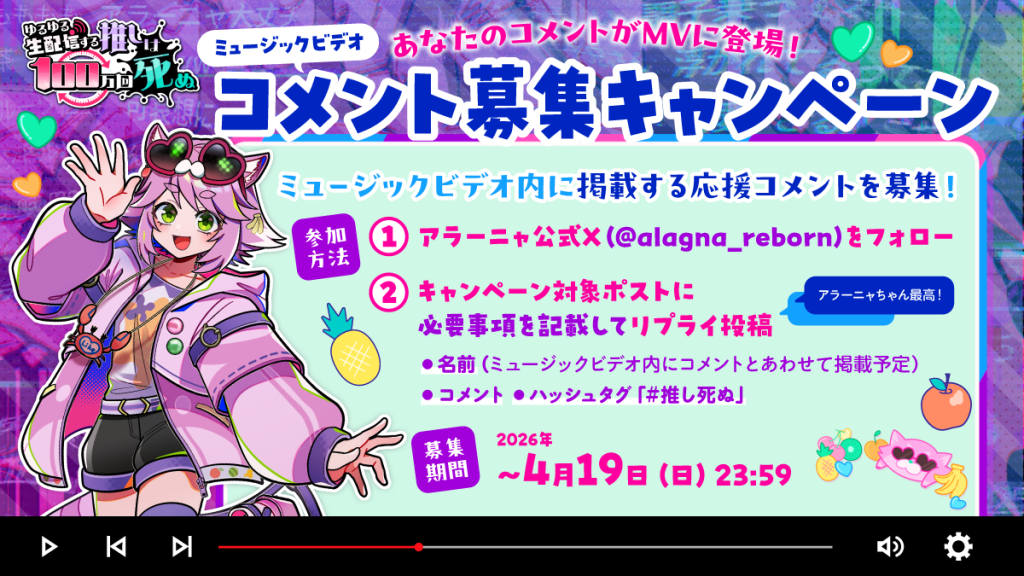 本ゲームのヒロイン アラーニャの公式X(@alagna_reborn)の該当ポストに、必要事項を記載の上リプライ投稿することで応募いただけます。ぜひ皆さまのコメントで、ミュージックビデオを一緒に盛り上げてください。