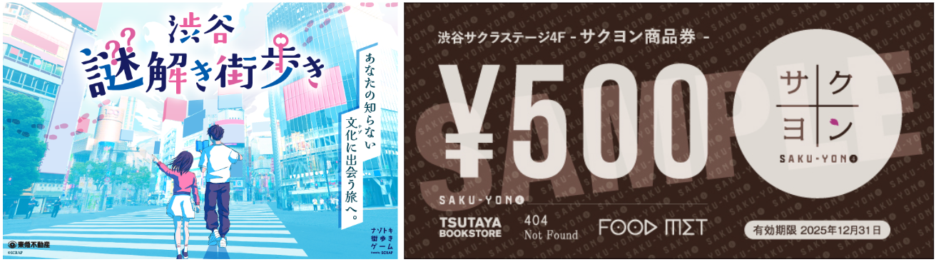 2025年9月18日(木)よりスタートする、ナゾトキ街歩きゲーム『渋谷謎解き街歩き』の早期参加者特典として、渋谷サクラステージ4F「サクヨン」で使える500円分の商品券を数量限定でプレゼントします!