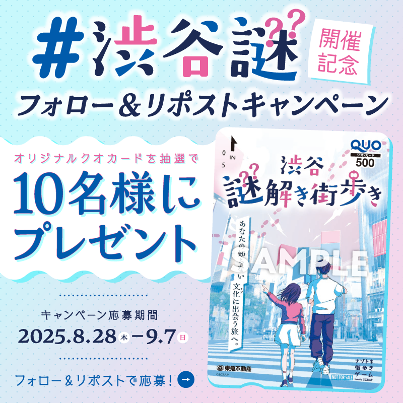 ナゾトキ街歩きゲーム最新作『渋谷謎解き街歩き』の開催決定を記念して、フォロー&リポストでオリジナルQUOカード500円分を抽選で10名様にプレゼントするキャンペーンを実施いたします!!