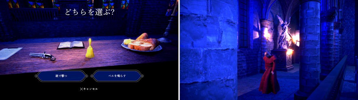 銃を撃つのか、ベルを鳴らすのか…正しい選択をすれば次へ進めますが、間違えると最初に戻り、ループするシステムになっています。