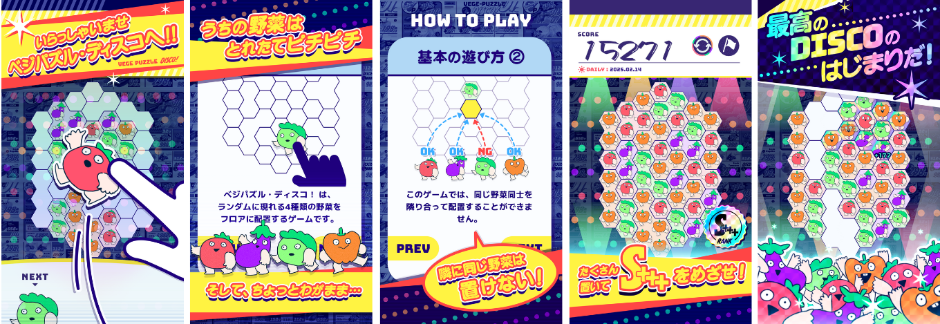 『VEGE PUZZLE DISCO!』は、夜のスーパーマーケットを舞台に、ファンキーでクレイジーな野菜たちがディスコ調に踊り出す、スマホでできるパズルゲームです。