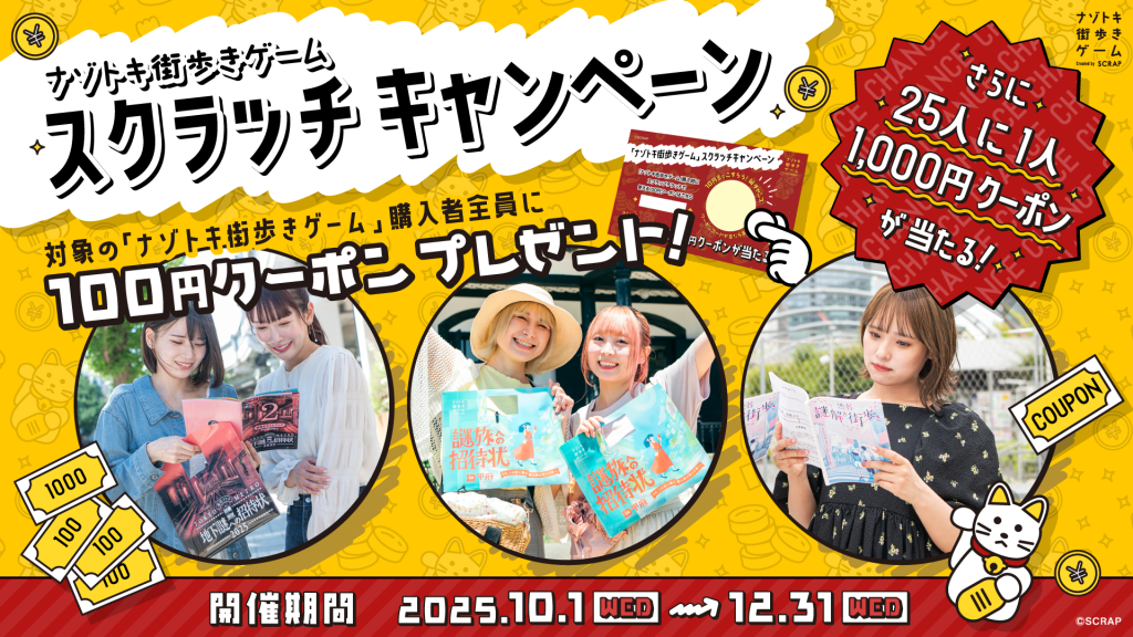 2025年10月1日(水)〜12月31日(水)の期間中は、対象の「ナゾトキ街歩きゲーム」謎解きキットを購入した方全員に、100円分の割引クーポン付きスクラッチカードをプレゼント!