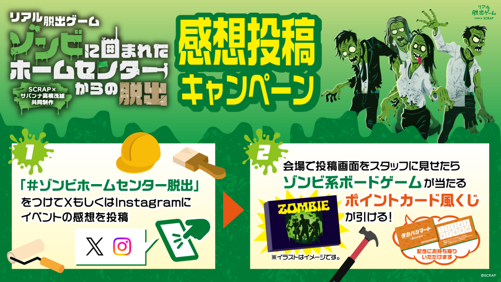 ①イベント参加後に「#ゾンビホームセンター脱出」をつけてX、Instagramに感想を投稿